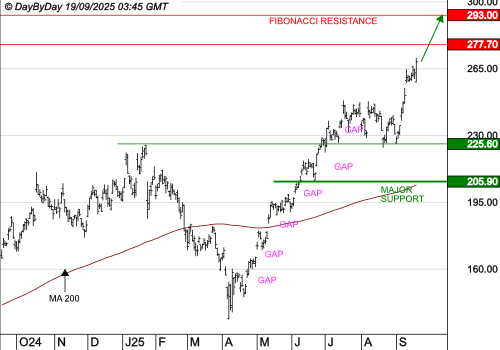 Les objectifs suivants sont à 277,70 $ et 293,00 $. La tendance serait invalidée sous le support à 205,90 $.