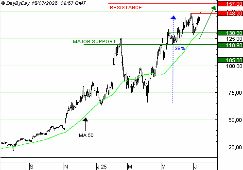 Palantir a poursuivi son rebond pour revenir sur son précédent sommet historique. Ce seuil peut provoquer des prises de bénéfice et ralentir la progression. Nous proposons une prise de profit partielle.